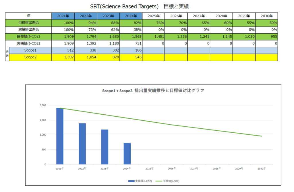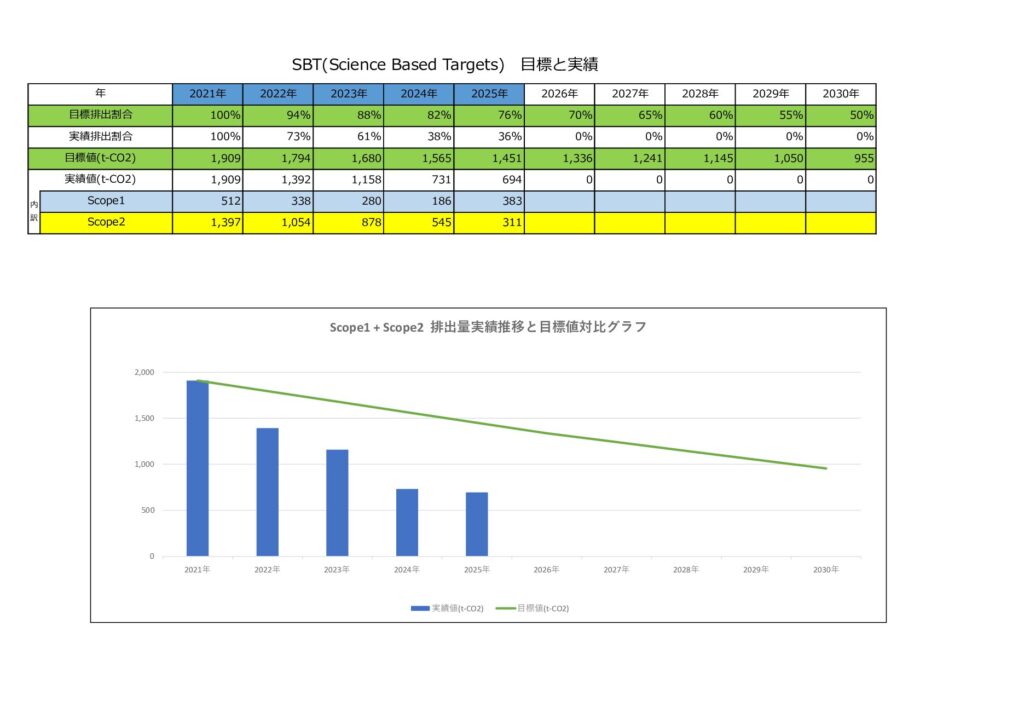 弊社は、2006年3月にISO14001の認証を受け環境保全に積極的に取り組んでおりますが、2021年より更なる取組強化を目的に二酸化炭素排出削減目標を掲げ目標達成に向けて取り組みを進めております。2025年7月には弊社が掲げる二酸化炭素排出削減目標について、パリ協定と整合性のある温室効果ガス排出削減目標の国際認証である「Science Based Targets」SBTの認証を受けました。この目標において省エネの推進と再エネを利用した電気使用率の向上やガス乾燥設備の電化を主要施策として2030年までに、2021年を基準年として50%の二酸化炭素排出量削減を達成します。
